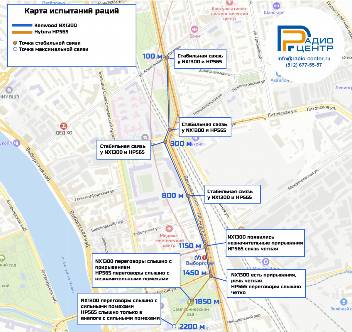 Испытания проводились на частоте 433,075 МГц, с одинаковой выходной мощностью, с полностью заряженными аккумуляторами, в плотной застройке, включая железнодорожные пути и мосты.