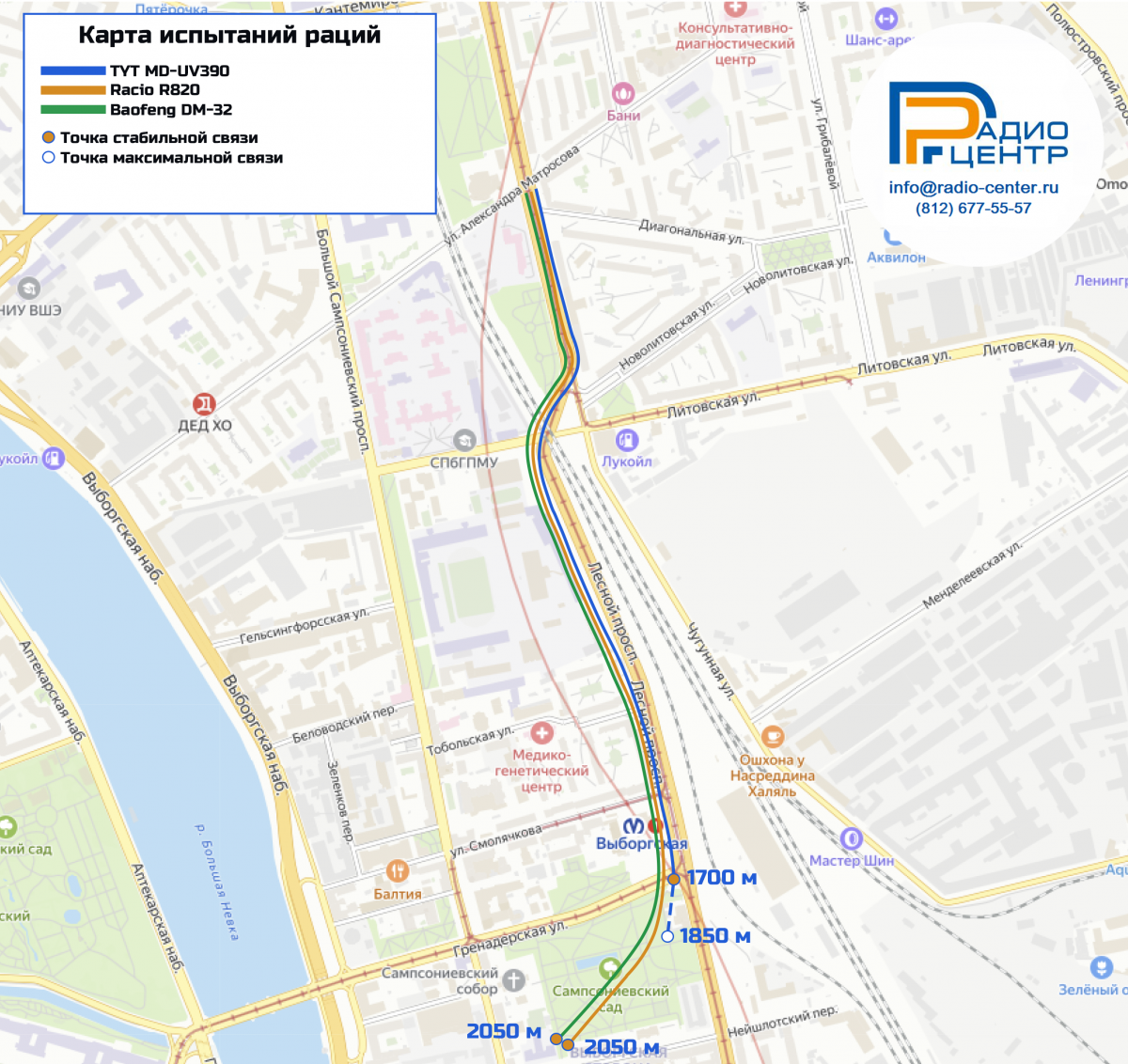 Испытания проводились на частоте 433,075 МГц, с одинаковой выходной мощностью, с полностью заряженными аккумуляторами, в плотной застройке, включая железнодорожные пути и мосты.
